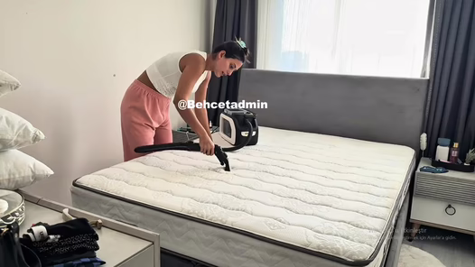 Göksü Düldül vakumla yatağı süpürüyor, çarşafları seriyor ve odasını toparlıyor, seksi pozlarda bükülüyor.